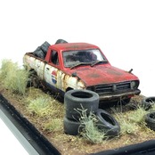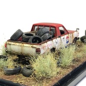 錆て朽ちたウェザリングを施したダイキャストカーとジオラマケースのセット。